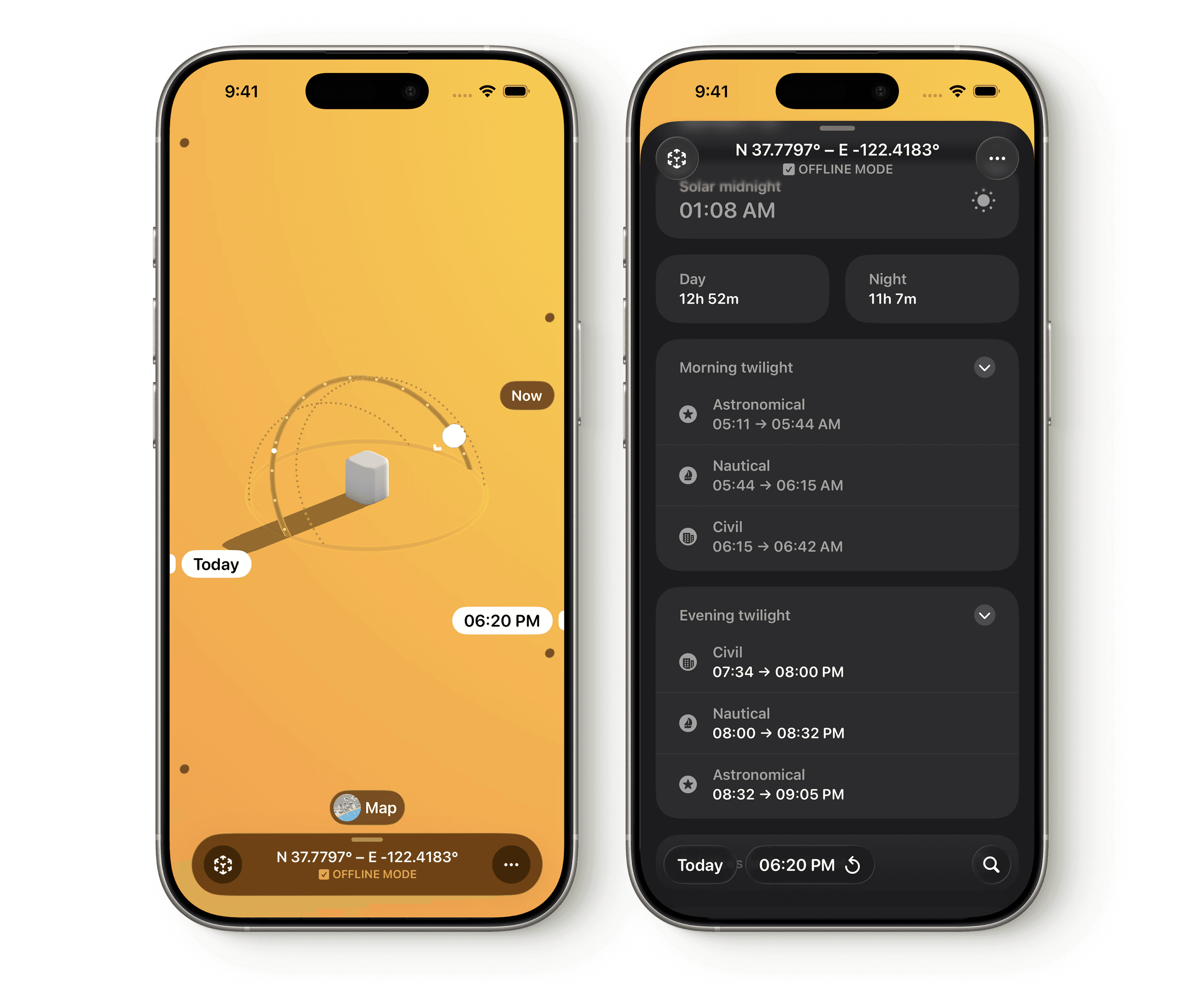 Most features, including solar event timings, work even without an internet connection—so you can plan sun paths, check shadows, and view sun event times anywhere, even off-grid.