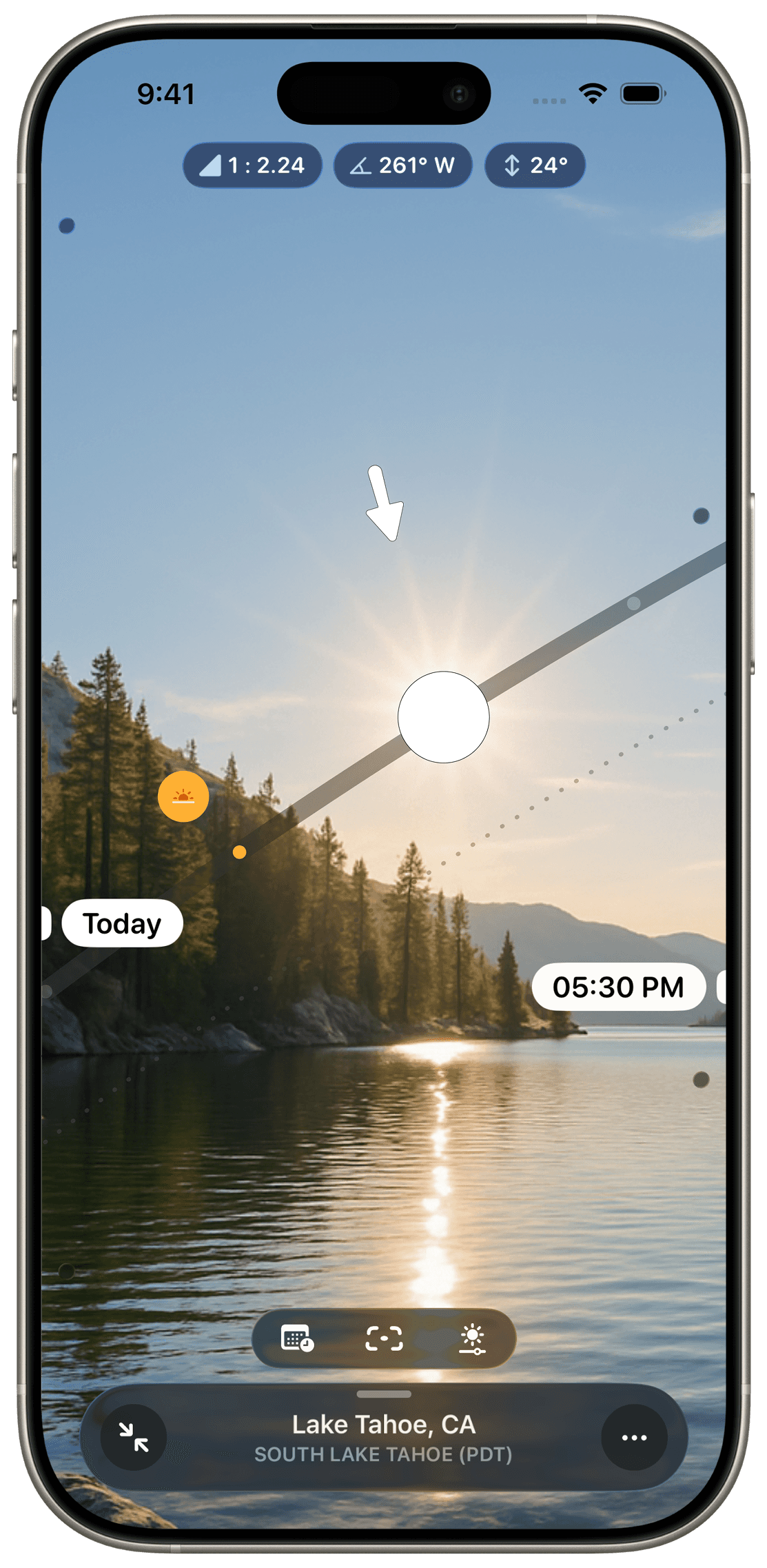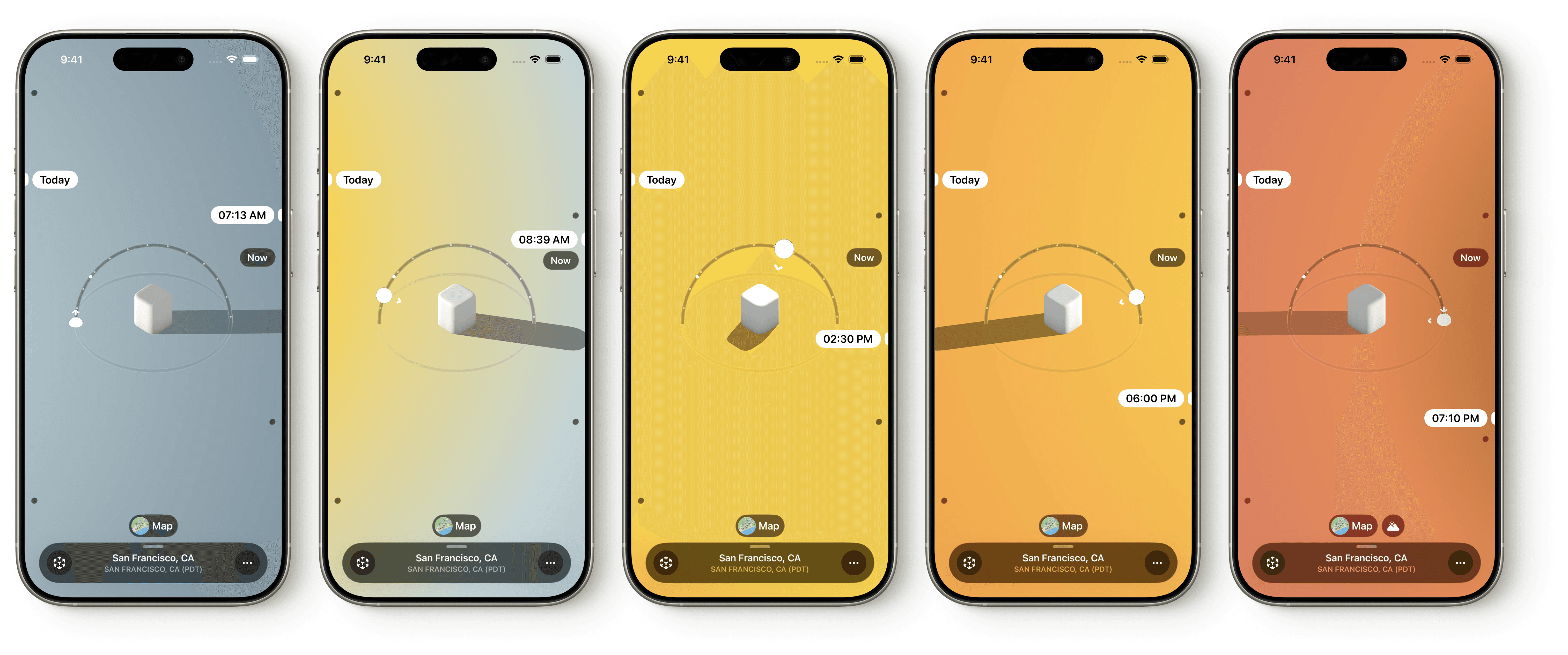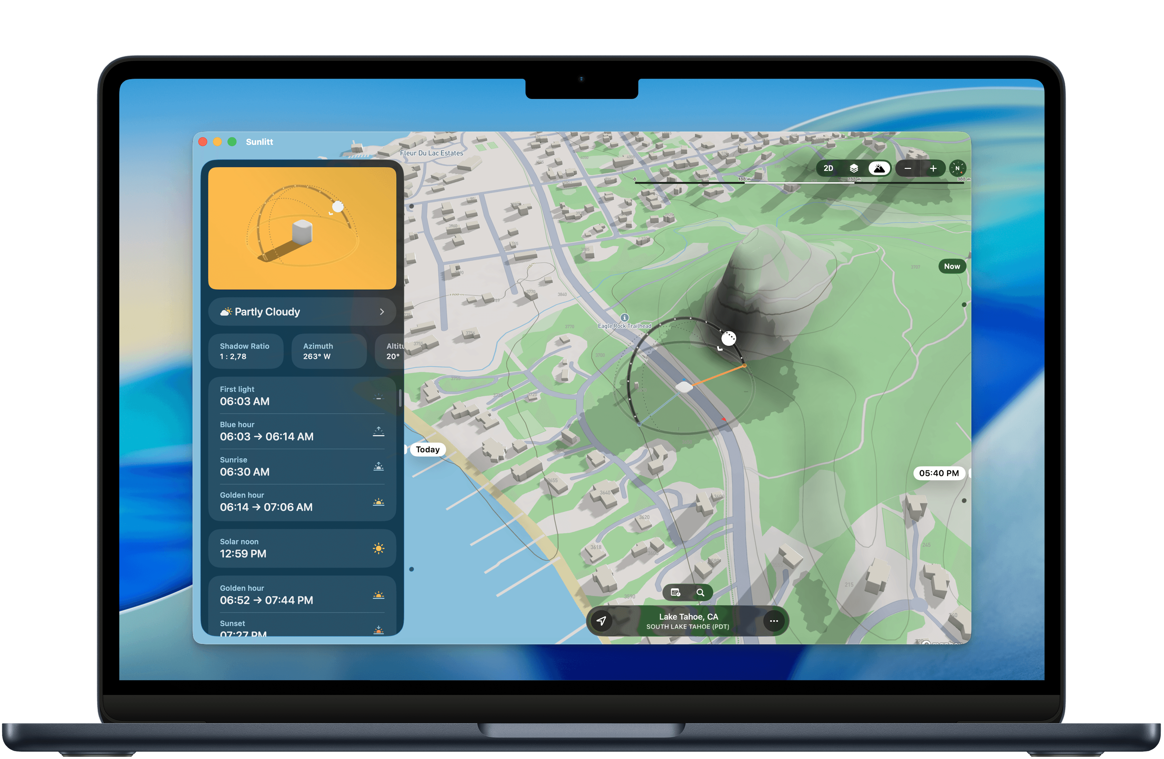 Sunlitt shows the sun’s position at any time and date, along with dynamic sky gradients that shift with each light phase: golden hour, blue hour, twilight, and more.